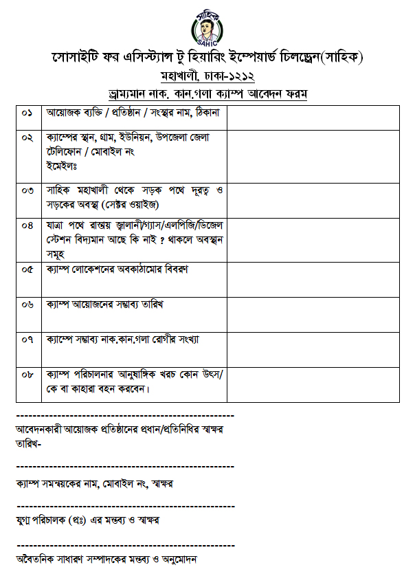 Bangladesh is a riverine Country. The rural marginalized population are mostly engaged in the profession like Agriculture, fishing and other rural based profession. These people are more susceptible to ear diseases then the urban ones. More so, because of there no education or poor education they even at times can not realize that they are born deaf or deaf at an early age due to natural or other causes of major or minor hurts or accidents. To help this underprivileged people living at the remote areas of the country, where desired medical facilities are not available. SAHIC runs there âRural ENT Campsâ. This camps mostly identify the ear problems and give spot treatment to the patients. Critical oneâs are referred to our base hospital in Dhaka. This camp projects have become very successful with huge response from the locals.
